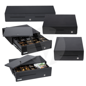 Kassenlade, Frontöffnung, Retail, 460x130x230mm, 4 Scheinfächer (vertikal), 8 Münzfächer, herausnehmbar, 1 Belegfach, 1 Scheckschlitz, Zylinderschloß, 3 pos. Schloss, gleiche Schließung, 24V, RJ11, separat bestellen: Schnittstellenkabel, Farbe: anthrazit