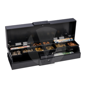 Kassenlade, Klappdeckel, Divers (Eigenschaften/Merkmale), Einsatz: 4 Scheinfächer, 8 Münzfächer, 2 pos. Schloß, gleiche Schließung, Schlossverriegelung, Maße, B 459mm, H 100mm, T 155mm, Zubehör, Optionales Zubehör, separat bestellen: Schnittstellenkabel, Basis, Farbe, Farbe: anthrazit
