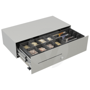 Kassenlade, Frontöffnung, 453x130x224mm, 6 Scheinfächer, 8 Münzfächer, 1 Belegfach, 3 pos. Schloss, unterschiedliche Schließung, 75er Serie, Farbe: anthrazit