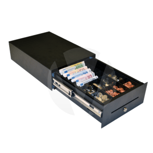Kassenlade, Frontöffnung, Maße (BxHxT): 275x120x370mm, Einsatz: 6 Scheinfächer (vertikal), 8 Münzfächer, herausnehmbar, 1 Belegfach, 1 Scheckschlitz, 3 pos. Schloss, unterschiedliche Schließung, 24V, RJ11, schwarz