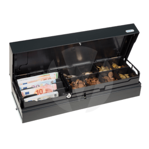 Kassenlade, Klappdeckel, Maße (BxHxT): 460x100x172mm, Einsatz: 5 Scheinfächer, 8 Münzfächer, 1 Belegfach, verschließbare Abdeckung, Anschluß an Kassendrucker, RJ12, inkl.: Kabel (RJ12), Base, Farbe: anthrazit