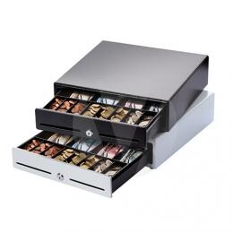 Kassenlade, Frontöffnung, Maße (BxHxT): 330x101x330mm, Einsatz: 4 Scheinfächer (horizontal), 8 Münzfächer, 1 Scheckfach, 3 pos. Schloss, Anschluß an Kassendrucker, RJ12, Farbe: weiß