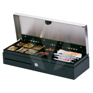 Kassenlade, Klappdeckel, Maße (BxHxT): 460x100x170mm, 6 Scheinfächer (vertikal), 8 Münzfächer, 1 Scheckfach, 2 pos. Schloß, unterschiedliche Schließung, Anschluß an Kassendrucker, RJ12, Farbe: silber/schwarz