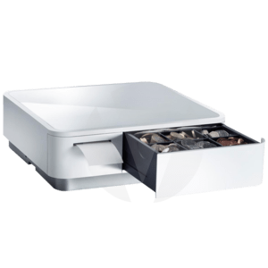 Kassenlade-Bondrucker-Kombination, Frontöffnung, Maße (BxHxT): 308x100x300mm, Einsatz: 4 Scheinfächer, 6/8 Münzfächer, 1 Scheckfach, Druck: Thermodirekt, Medienbreite (max): 58mm, Rollendurchmesser (max.): 50mm, Geschwindigkeit (max.): 100mm/Sek., Schnittstellen: 1x Slave USB, 2x Host USB (0,5A), 2x Host USB (1,5A), USB-C (für iOS), inkl.: Netzkabel (EU, UK), USB-C Kabel(weiß), Tablet-Halterung (doppelseitig), Bonrolle, Farbe: weiß